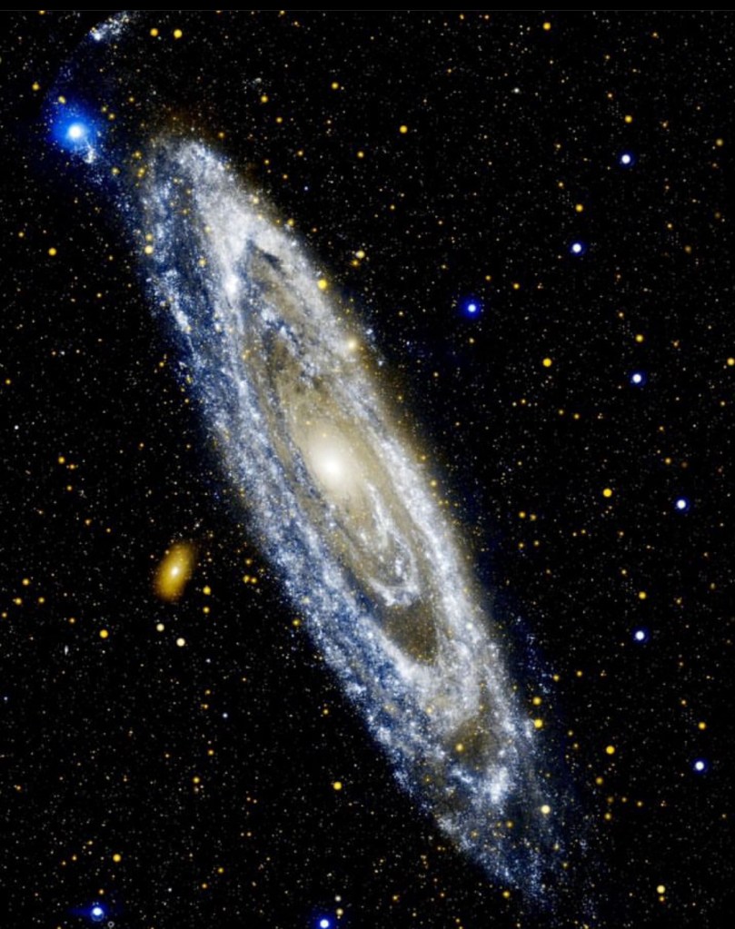 The scientific name for this beautiful spectrum is called M31. But it is known as the Andromeda Galaxy and majestically categorized for its outer ultraviolet rings providing a spherical backdrop and array of lights and stars in a galaxy actually not too far away, as far as galaxies go. This galaxy is 260,000 light years away, which is miraculous when you think of distance, and complexity of this array with respect to the earth. You canβt help but think and imagine what an amazing explosion must have taken place in order to assemble such an intriguing cluster of gas, plasma, stars and definite collision with neighboring elliptical Galaxy M32.